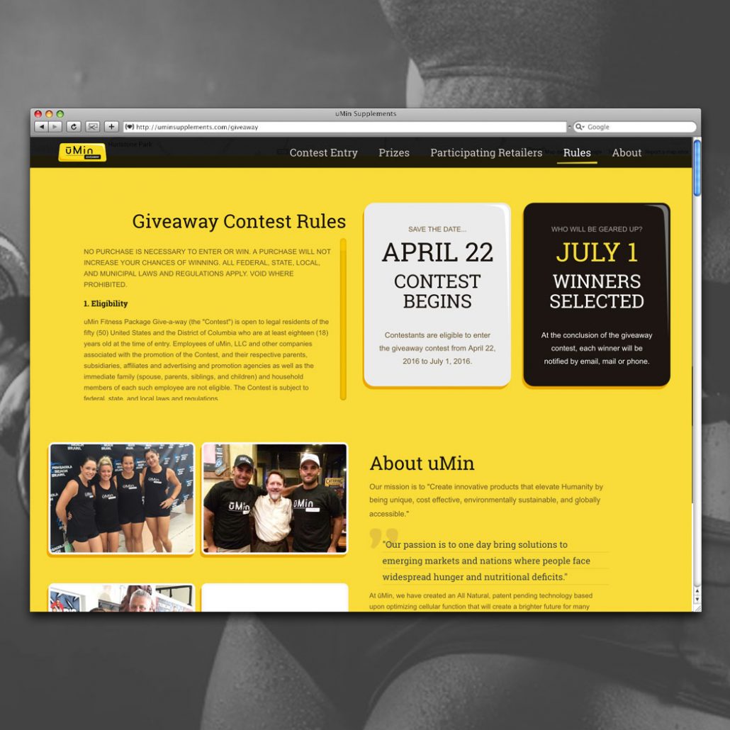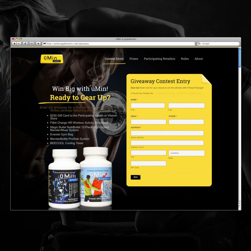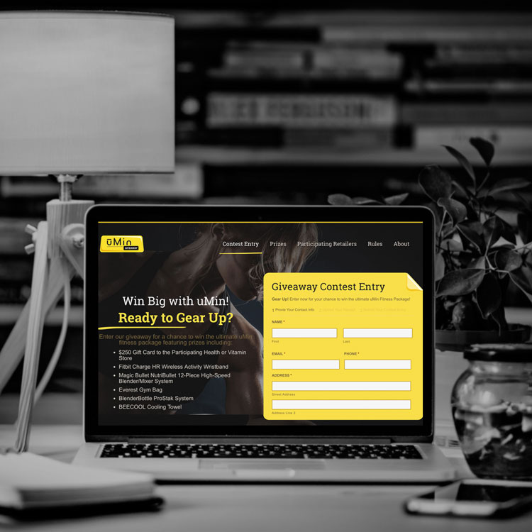 Our team created a responsive landing page for a uMin Supplements promotion. Each participating retailer had a dynamic, unique url to direct customers to the landing page where a form would collect their information and upload the customer’s proof of purchase.